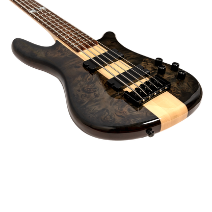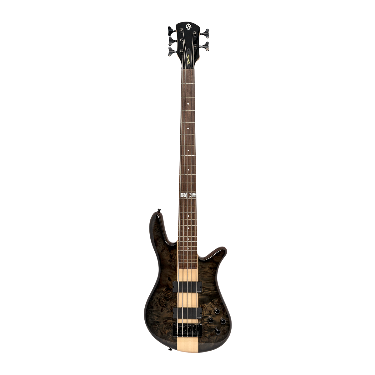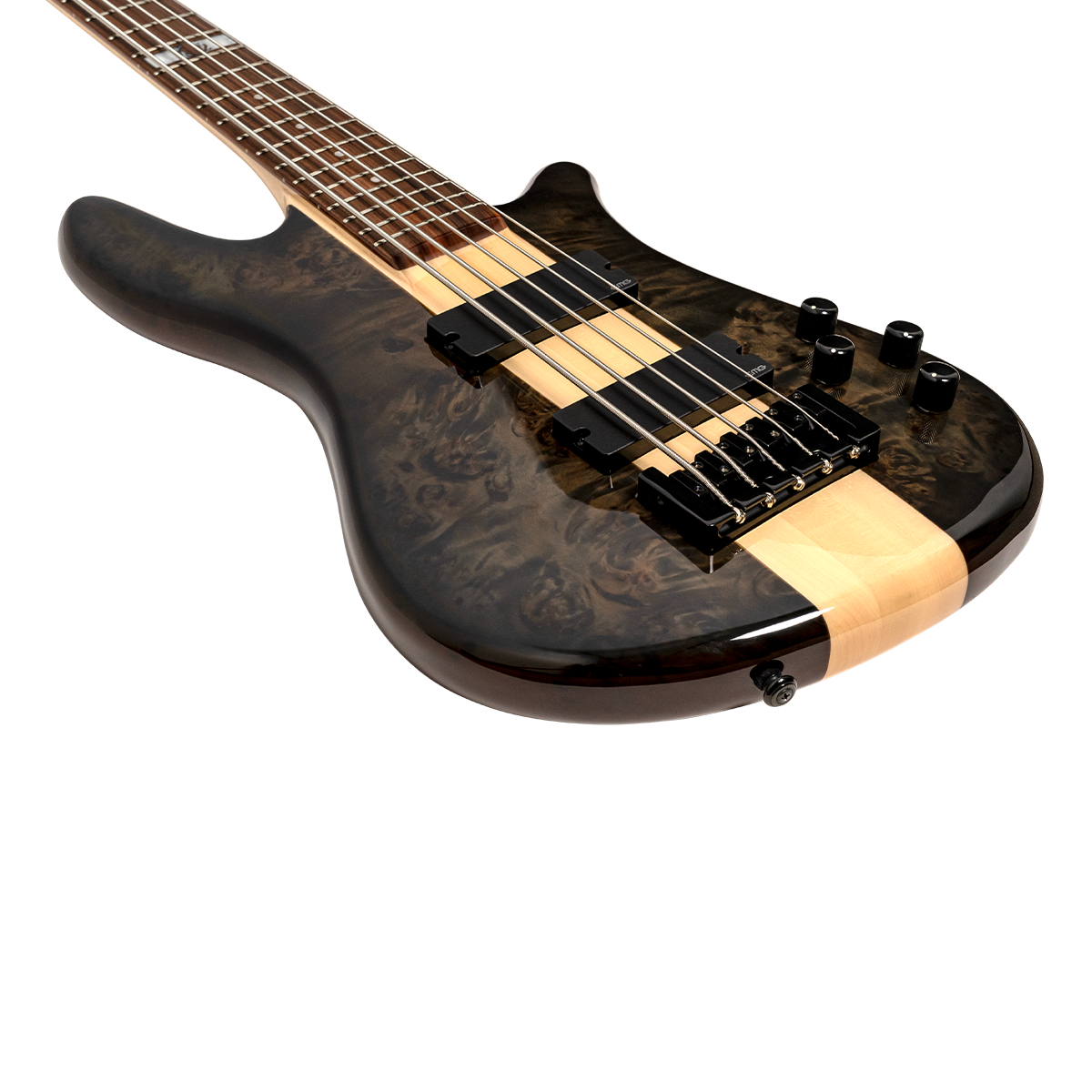 Dan’s model is accentuated with a custom inlay and a figured poplar burl, but the construction remains very similar to that of a classic Spector. The body wings are fully carved from solid Maple for a precise and vibrant tone. The 3-piece Maple neck is glued directly to the body wings, completing the neck-thru construction. The Pau Ferro fingerboard features 24 frets, with a custom inlay designed by Ben Tuttle on the 12th fret. The NS-2000/5 Dan Briggs is equipped with a pair of EMG humbuckers and a TonePump Jr. active circuit. Together, these electronics deliver a powerful range of tones, perfect for cutting through the mix or laying back on the groove. Whether you’re a fan of Between the Buried and Me or a virtuoso bassist yourself looking for a reliable instrument, Dan’s signature Spector is an excellent choice for your next 5-string.